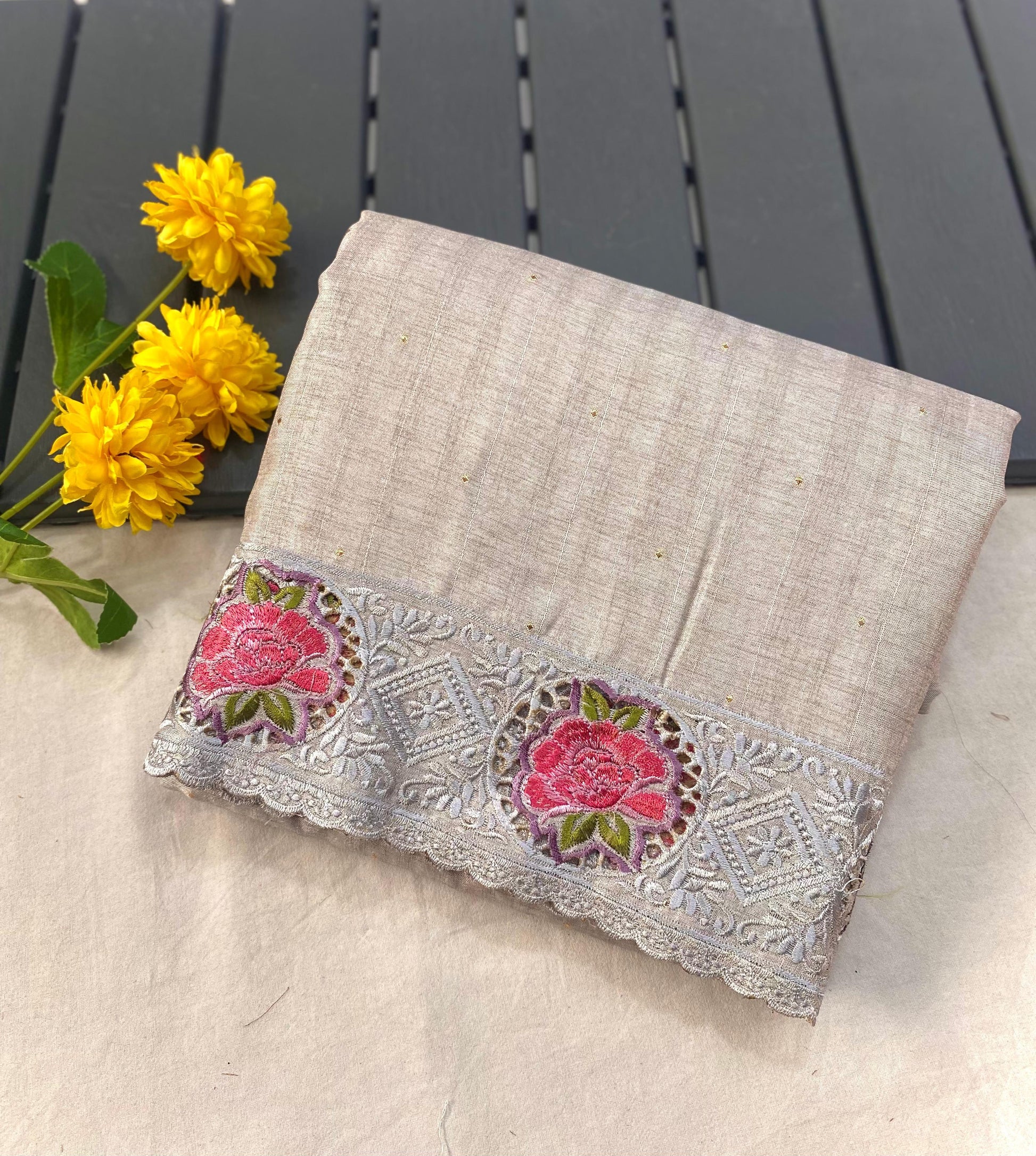 This exquisite Tussar Silk saree features a soothing pista green base elegantly framed with a delicately crafted cutwork border. The addition of subtle pink floral motifs enhances its sophisticated appeal, making it ideal for formal occasions and festive wear. The natural texture of Tussar silk ensures breathability and comfort, while the refined cutwork detailing highlights artisanal craftsmanship. This saree seamlessly blends traditional charm with a modern palette, offering a graceful drape and timeless elegance.